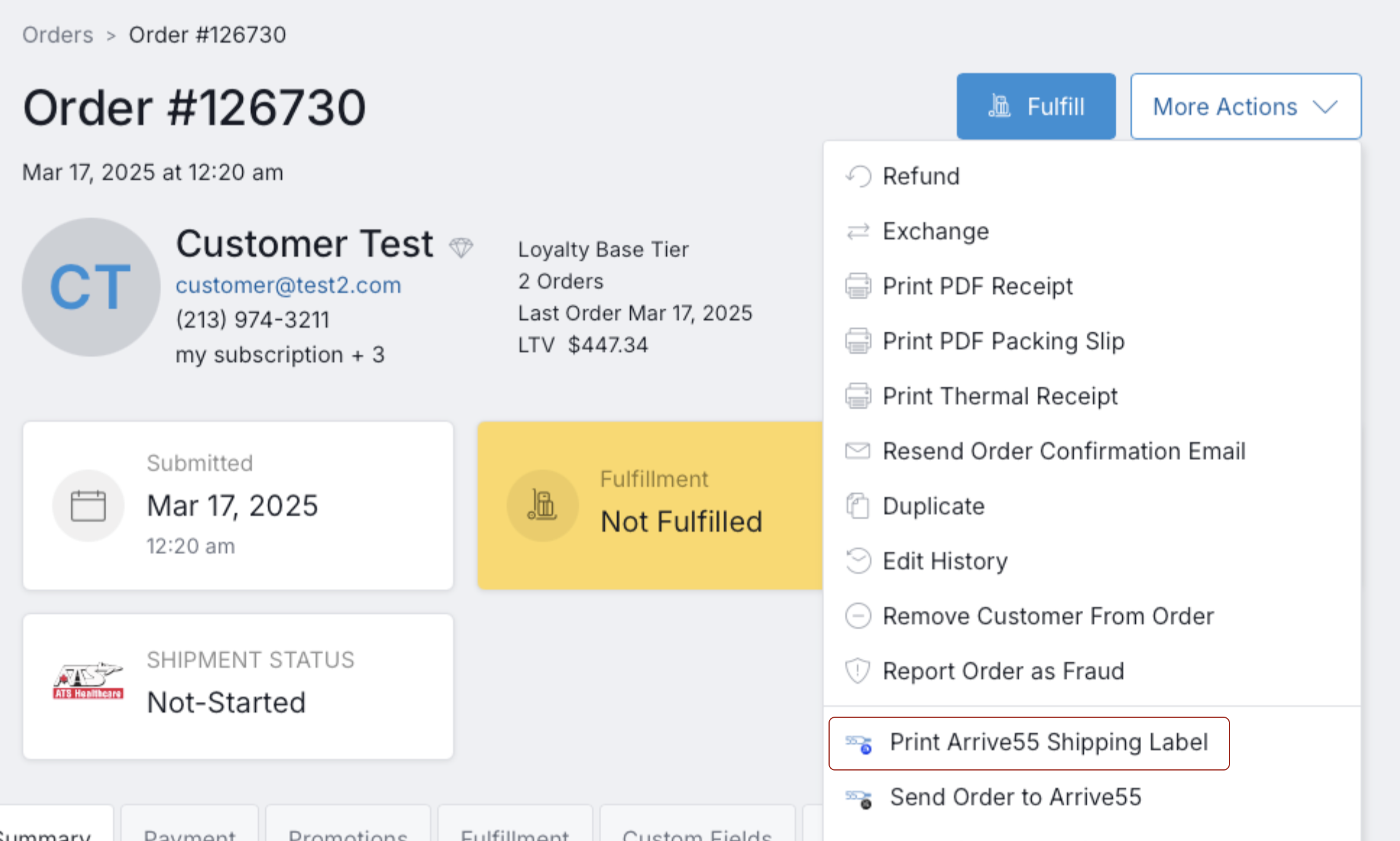 To manually push an order to Arrive55, head into the Order Detail Page, and from there, click on More Actions. You will see two actions related to Arrive55.