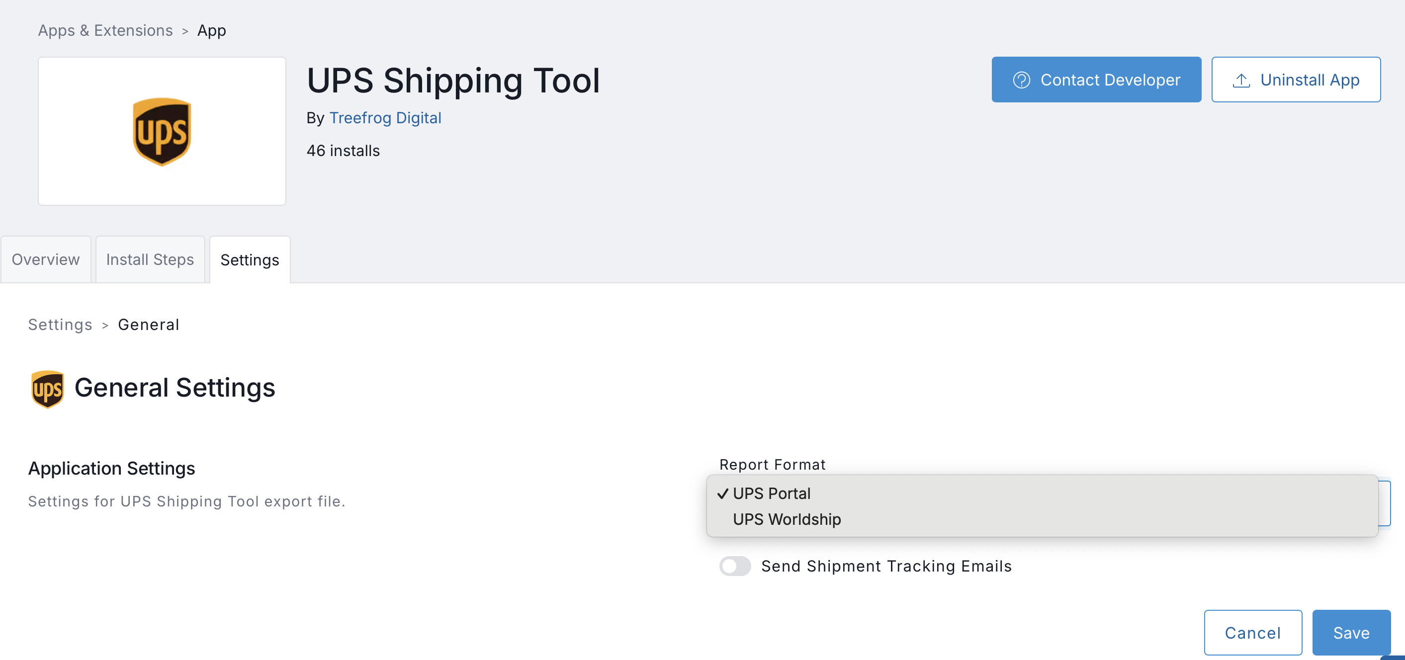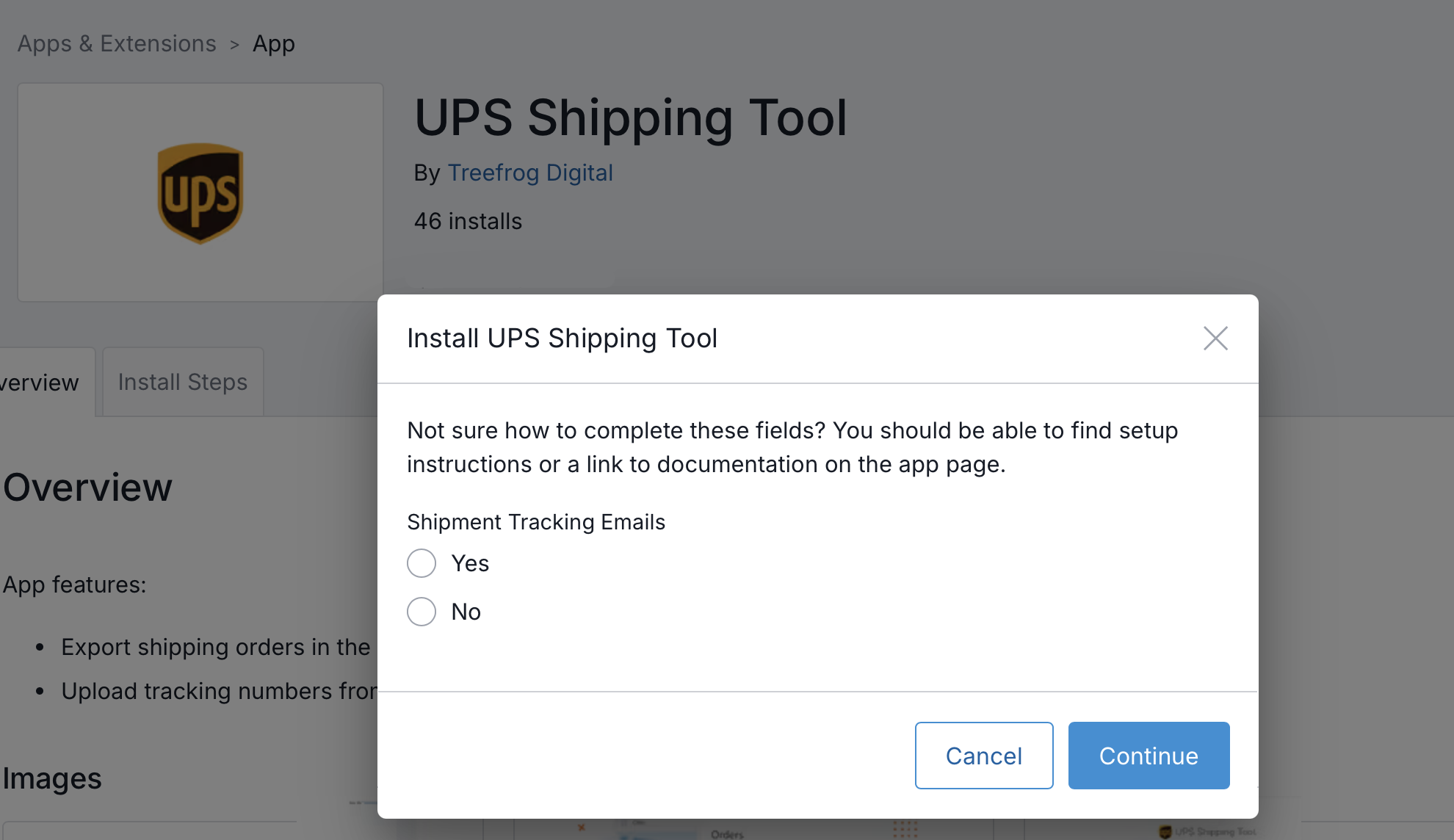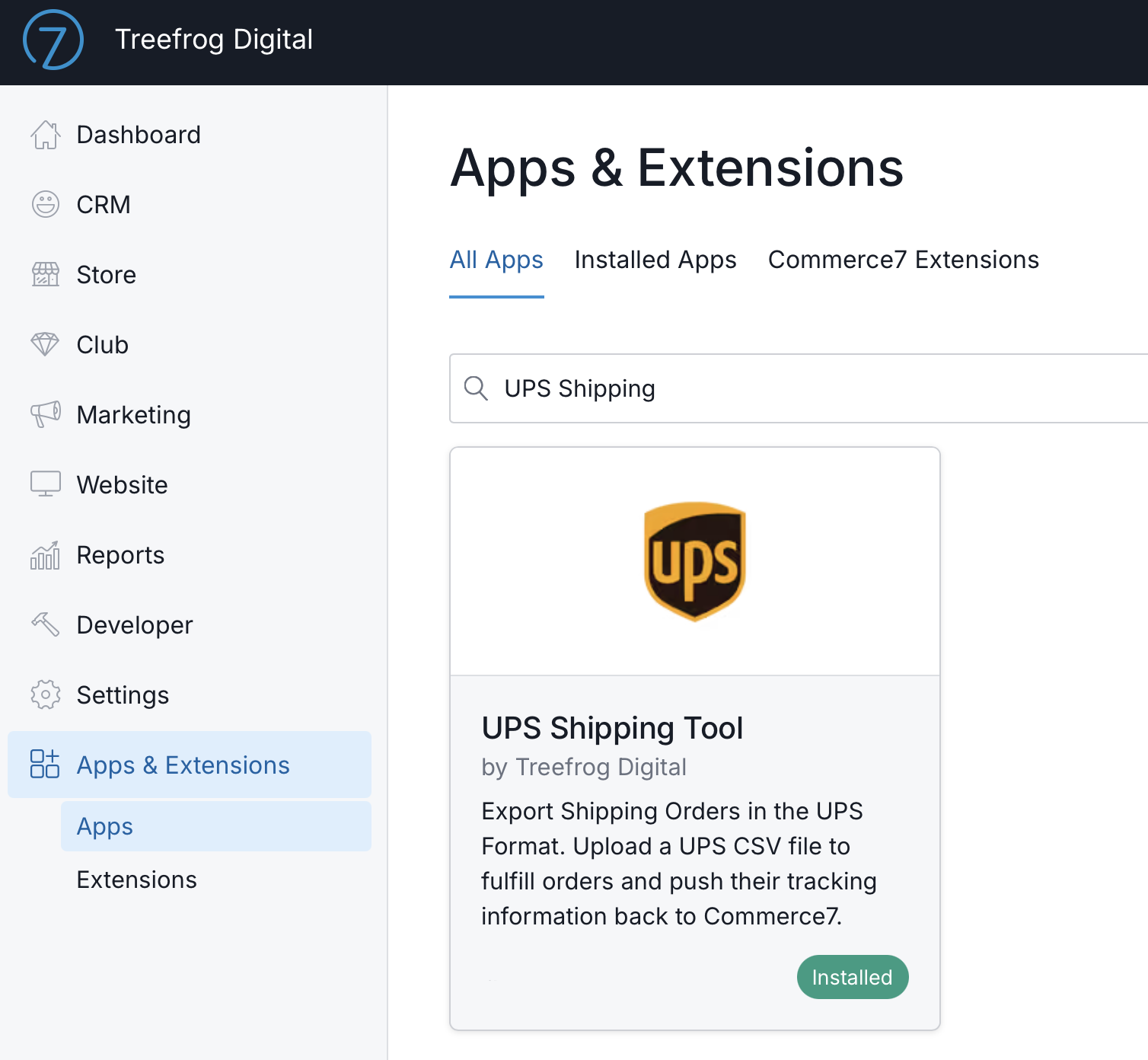 - Search for the UPS Shipping Tool by Treefrog Digital, click on the app, and then click Install App.