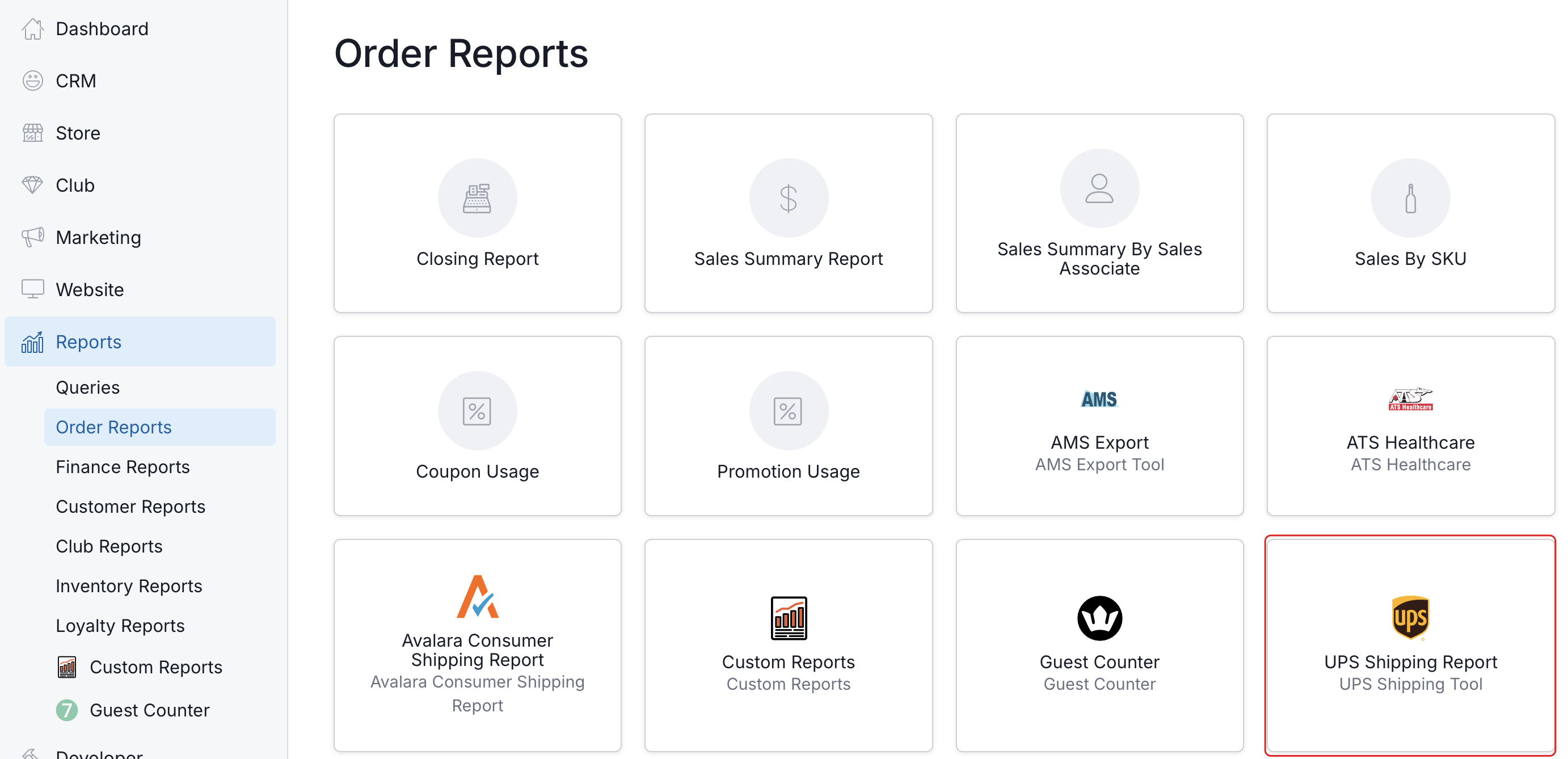 2. In Commerce7, go to Reports → Order Reports → UPS Shipping Report