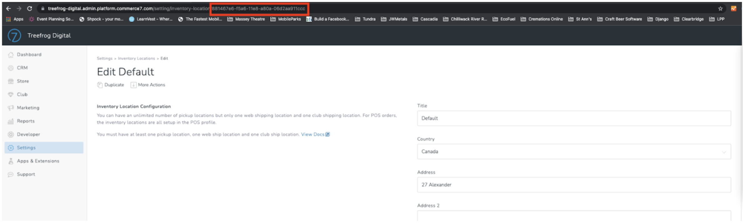 You can obtain the Inventory LocationID under Commerce7 > Settings > Locations by clicking on the desired location. The Location ID will be on the URL of your browser like it shows the red box in the following image: