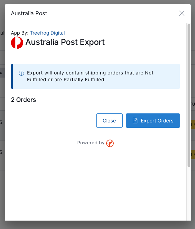 - A new window will open showing the number of orders to be exported. Only orders with a status of 'Not Fulfilled' or 'Partially Fulfilled' will be included.