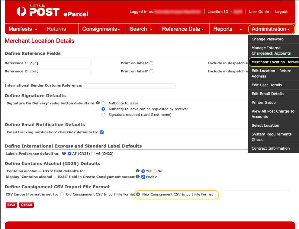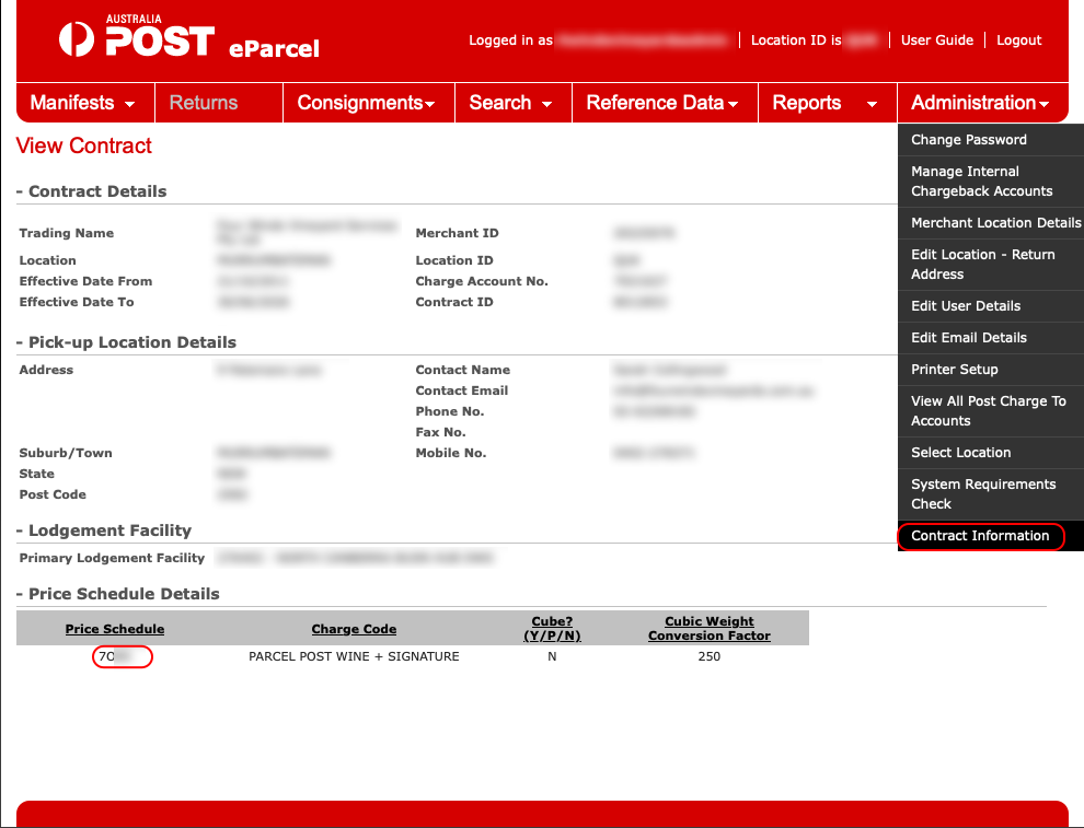 - From the main menu in the eParcel Portal, select Administration